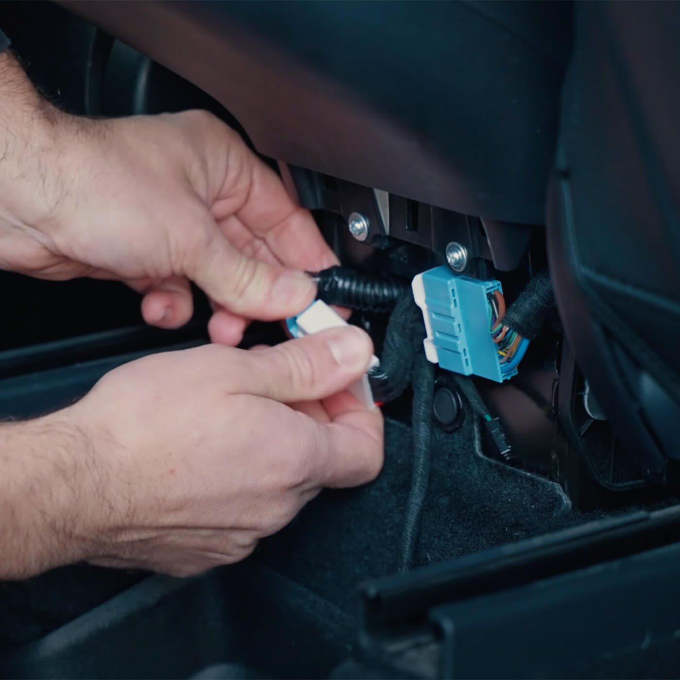 Diese Methode ist nur mit AMD-Prozessor kompatibel (Modelle nach 2021). Der Einbau erfolgt im vorderen rechten Fußraum unterhalb des Handschuhfachs. Die Kabel sind hier versteckt und unsichtbar – Ideal für alle, die das minimalistische Aussehen des Fahrzeugs beibehalten wollen.